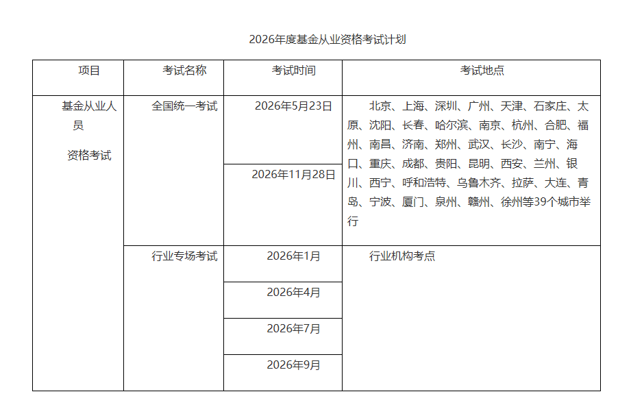 中国证券投资基金业协会现将2026年度考试计划公告如下: